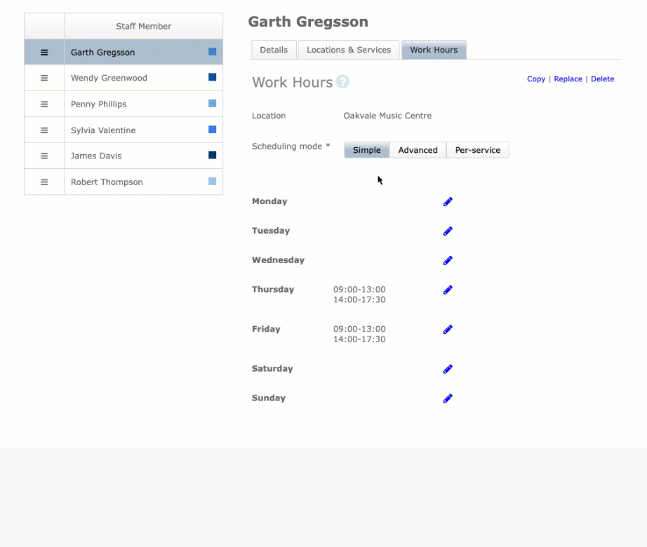 Jezzam provides three modes of scheduling - Simple, Advanced and Per-Service. These modes are available for both your staff and resource scheduling.